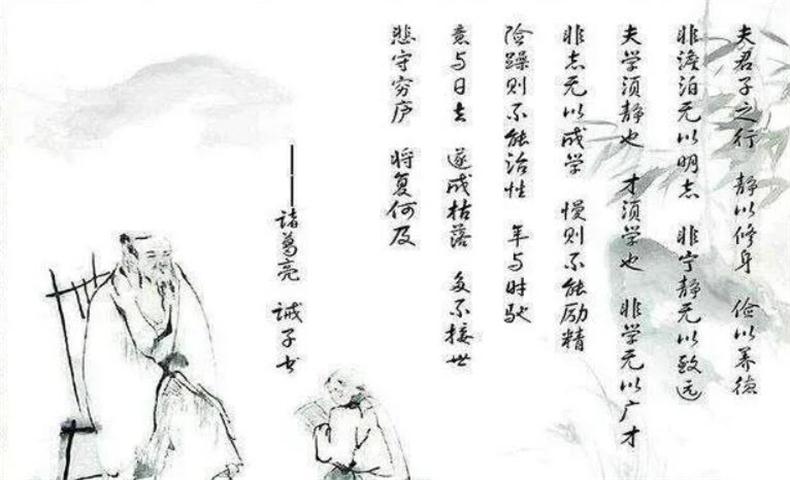 诸葛亮还教育儿子切忌心浮气躁,举止荒唐,他说:“年与时驰,意与日去,遂成枯落,多不接世,悲守穷庐,将复何及!”意思就是说若让年华意志随岁月逝去而无所作为,不接触世事、不为社会所用,那么最后只能悲哀地守着穷困的居舍独自神伤。诸葛亮先是点明儿子应该怎么做,然后从反面论证若没有遵循那会是怎样的后果,字字句句富含深刻道理,格外令人珍惜。文中的诸葛亮不仅是位慈父,更是名良师,文字间既有对大原则的把握,又有对细微小事的关心;既有对儿子的循循善诱,又有对儿子的关怀倍加,他是个合格的父亲,更是个伟大的人生导师。