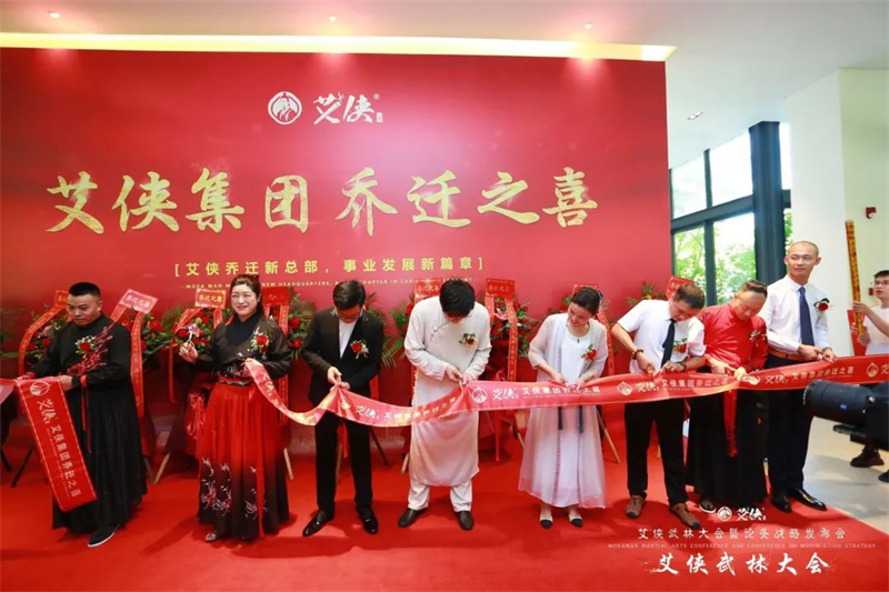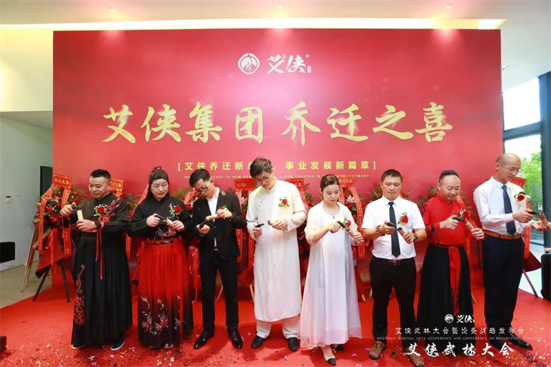 艾侠集团董事长曾子默先生、艾侠传蕲商学院院长王誉霏女士、艾侠联合发起人&特聘战略顾问方雨先生、艾侠蕲艾生产基地负责人王小飞先生、传蕲商学院健康部部长郭栩帆女士、传蕲商学院事业部部长姜愷扬先生、传蕲商学院事业部运营总监严旭东先生、2019年年度销售冠军王雨圣先生八位领导、嘉宾以及艾侠精英共同完成乔迁剪彩,金剪齐开,意味旗开得胜,宏图大展,蒸蒸日上!