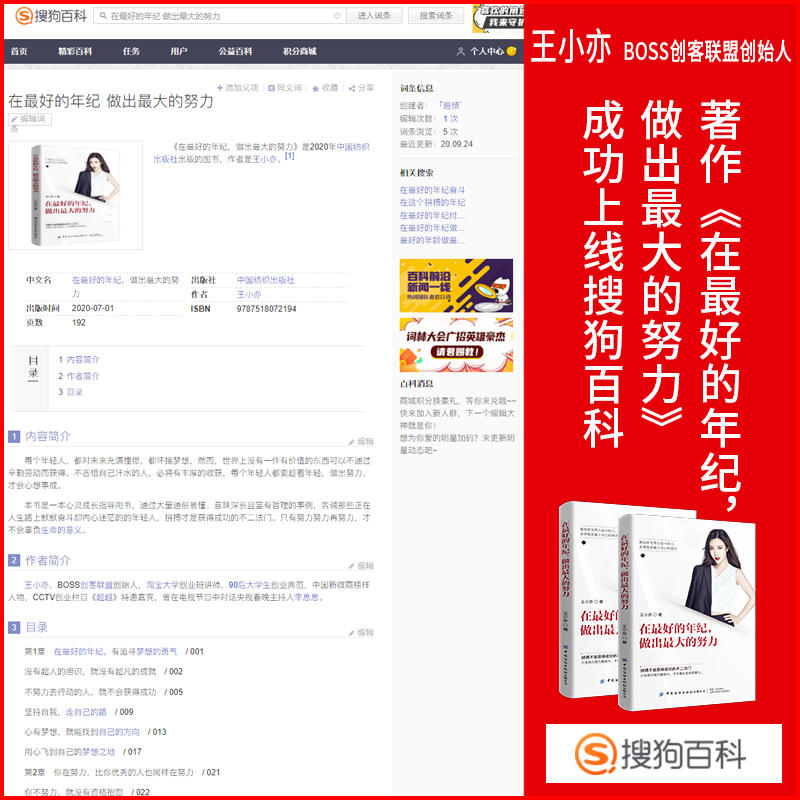 近日,由中国纺织出版社出版、出书大师网全权代理出版策划、王小亦老师创作的著作《在最好的年纪,做出最大的努力》正式上线百度、搜狗、头条百科平台,同时也上线了豆瓣读书平台,呈现出其独特的品牌价值!