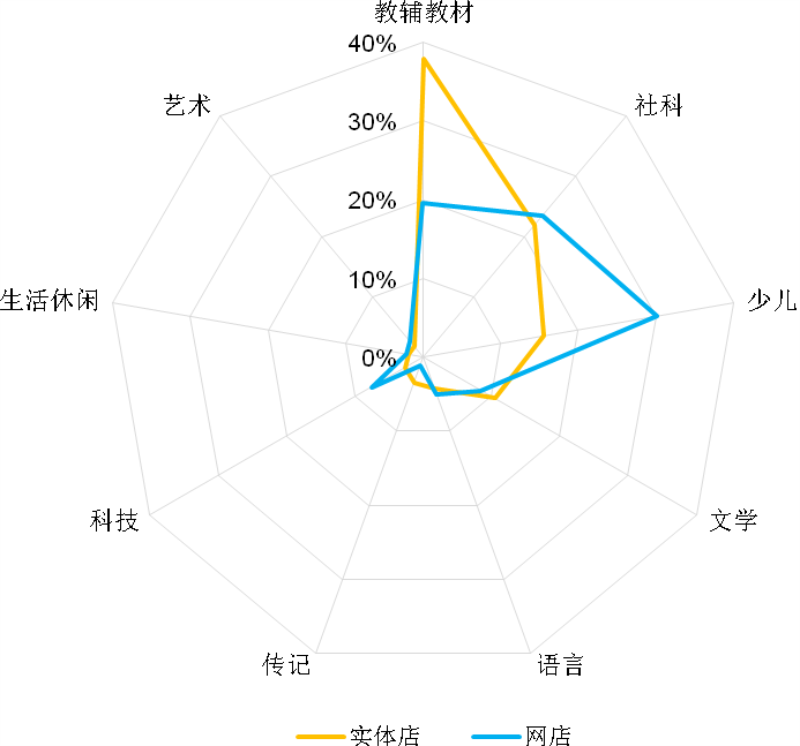 从今年前三季度各类图书的码洋构成来看,亲子阅读、学生阅读和主题出版相关图书已经成为图书市场的主动力,教辅教材、少儿、学术文化、传记类所占的码洋比重均较去年同期有所上升,而大众阅读类别所占的码洋比重则有所下降。从不同渠道来看,教辅教材类依然是实体店渠道中码洋比重最大的类别,同时该类在两渠道中码洋比重增幅均比较明显,增幅超过4个百分点。少儿市场是网店渠道中码洋比重最大的类别,该类在实体店渠道下降明显,而在网店渠道中码洋比重增幅超过了2个百分点。文学类在两渠道码洋比重均出现下降,降幅超过1个百分点。