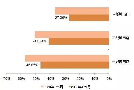 将实体书店按照不同规模和所处城市级别进行分类,各类书店的降幅都有所收窄,位于一线城市的书店和规模较大的超大书城、大书城受疫情影响较为严重,负增长幅度均在45%左右,三线城市以及规模较小书店降幅相对较小,和上半年相比,降幅均有所收窄。