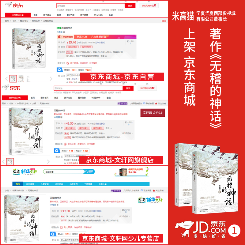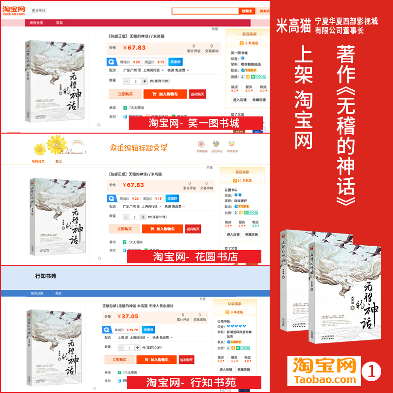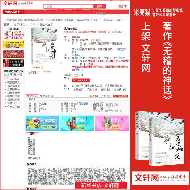 近日,宁夏华夏西部影视城有限公司董事长米高猫创作、出书大师网全权出版策划、天津人民出版社出版的著作《无稽的神话》,成功上架当当、京东等全渠道,开启了火爆热销。日前,图书作品受到了广大读者朋友的关注与认可。