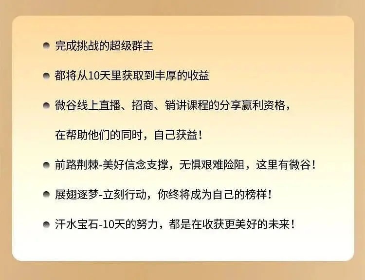 如果你是创业者,想提升自己的名气如果你从事新媒体行业,想提升粉丝粘性。加入训练营,将会有超级群主商业模式、超级工具使用详解、超级方法锁定顾客、超级直播实景演练等方式助你达成超级群主,学成下山转化财富。好了,今天我要分享的就这么多了,还希望对你有帮助。如果你需要更完整详细的社群运营实操技巧,就注关微同名注公众信号:微谷国际!查看