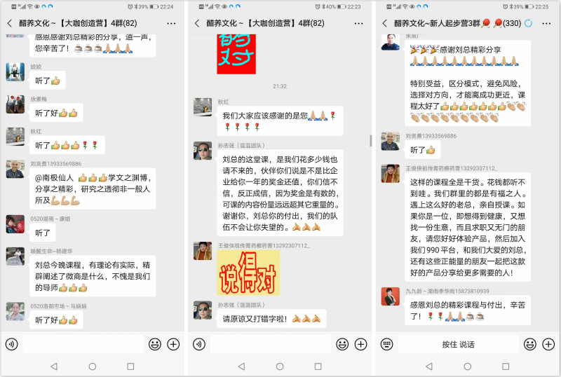 培训活动开启后,团队学员积极响应、努力学习,反响极佳。不少学员都表示,他们从课程中学到了许多有价值的知识与经验。有的学员表示:课程很精彩;而有的学员则赞扬:课程全是干货,既可以收获健康、又可以获得一份生意,可以帮助到很多人。在学员们纷纷点赞的同时,他们还积极认真地做好课程笔记,将实用、独到而又丰富的知识经验保存下来,作为自己能力提升的重要法宝。