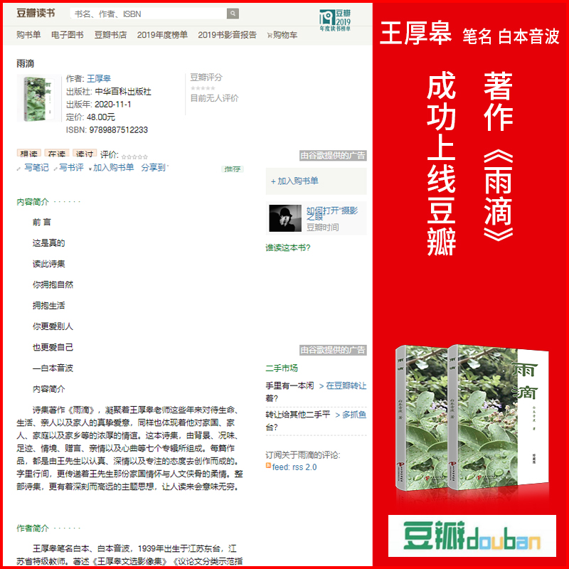 诗集《雨滴》正式上线百度、头条、搜狗等各大百科平台以及豆瓣读书,是王老师多年写作以及著作本身被机构和广大读者认可的一种证明,不仅体现了这本图书自身的权威性、被认可度、受欢迎度以及美誉度,而且更体现了图书作者王厚皋老师以及作品自身的实力。百度、头条以及搜狗等百科平台,作为国内极具权威性和可靠性的百科全书词条平台,对于诗集《雨滴》的上线,是有着非常巨大的品牌传播效应的。而豆瓣读书作为国内领先的读书社区,聚集着广泛的高素质的读者群体。诗集《雨滴》上线豆瓣读书,更是在众多高素质读者当中建立了广泛的作者个人价值权威认可。
