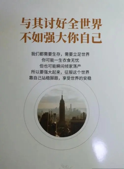 亲爱的,如果你也是如此,也许你可以读一读这本《与其讨好全世界,不如强大你自己》,他和那些励志的鸡汤故事有个区别,是一次次商业成功中获取胜利之后的经验分享,在成年人的世界里,他站在一个已经走过荆棘路的人的角度,去用自己曾经的人生智慧来对前半生走个路的路途进行总结,然后告诉你,什么才是“成功”,定义你自己的人生。