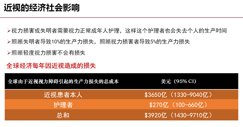 据2016年发布的我国首份系统研究视觉健康的白皮书《国民视觉健康》显示,我国5岁以上人群中,每3个人就有1个人是近视。如果不能采取有效的政策干预,预计5年左右,我国5岁以上人口的近视发病率将增长到50.86%至51.36%。白皮书同时指出,高度近视容易产生各类眼底病变,造成严重的永久性的视功能损害。近视的可遗传性和家族聚集性会影响我国未来的人口素质。目前,近视的问题在我国非常严重,严重到什么程度呢? 北京大学教授李玲于2015年发布的《国民健康视觉报告》中提到:近视不仅对生活带来不便,甚至影响到了收入水平。处于劳动年龄阶段的中度视力缺陷患者,年劳动收入比视觉健康的人群要低3796元,这一收入差距相当于城镇居民家庭人均可支配收入的1/10、农村居民家庭人均收入的1/3。这一人群的劳动收入损失总计约3909亿元。2012年各类视力缺陷导致的社会经济成本高达5600亿元左右,占GDP的比例高达1.1%左右。同时,青少年近视率高导致未来在航空航天、精密制造、军事等行业领域,符合视力要求的劳动力可能面临巨大缺口,将直接威胁我国经济社会可持续发展以及国家安全,近年来征兵、消防员、民航飞行员等的视力标准要求都在逐年降低。