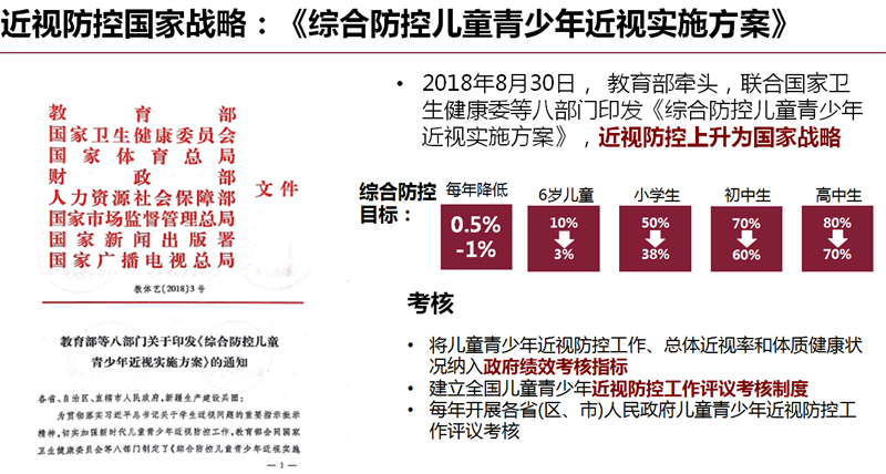 陈楠华:国家已经升级为由九部委齐抓共管,在共同制定的《综合青少年儿童近视防控实施方案》明确提出,到2023年,力争实现全国儿童青少年总体近视率在2018年的基础上每年降低0.5个百分点以上,近视高发省份每年降低1个百分点以上。到2030年,实现全国儿童青少年新发近视率明显下降,儿童青少年视力健康整体水平显著提升,6岁儿童近视率控制在3%左右,小学生近视率下降到38%以下,初中生近视率下降到60%以下,高中阶段学生近视率下降到70%以下,国家学生体质健康标准达标优秀率达25%以上。同时将儿童青少年近视防控工作、总体近视率和体质健康状况纳入政府绩效考核;将视力健康纳入素质教育;将儿童青少年身心健康、课业负担等纳入国家义务教育质量监测评估体系,对儿童青少年体质健康水平连续三年下降的地方政府和学校依法依规予以问责。