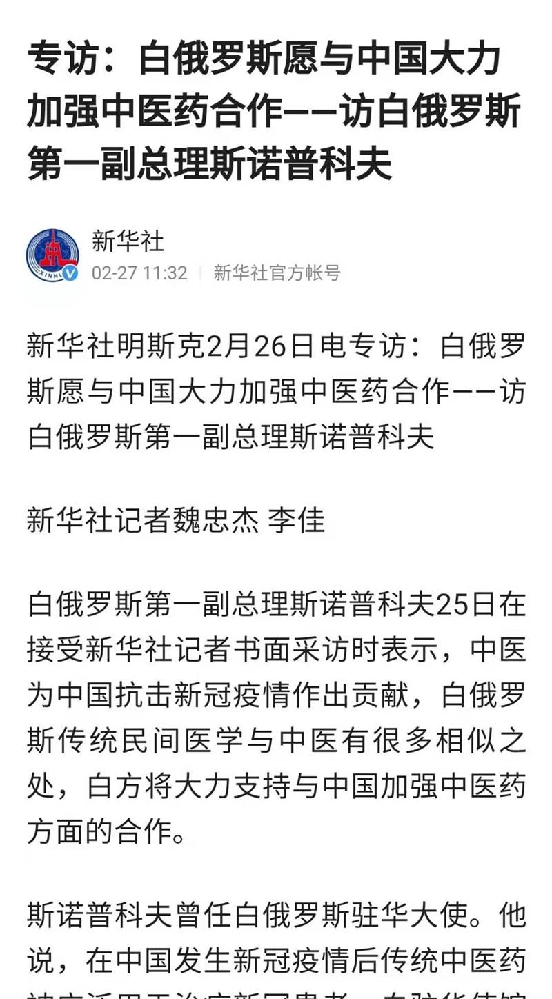 中医在中国抗击新冠疫情方面作出了巨大贡献,已有很多国家使用中医,白方将大力支持与中国加强中医方面的合作。