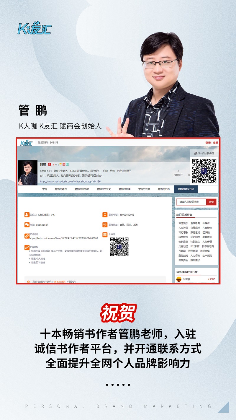 管鹏:庆贺K大咖 K友汇 赋商会创始人管鹏老师入驻出书大师网诚信书作者平台,个人品牌影响力全面升级
