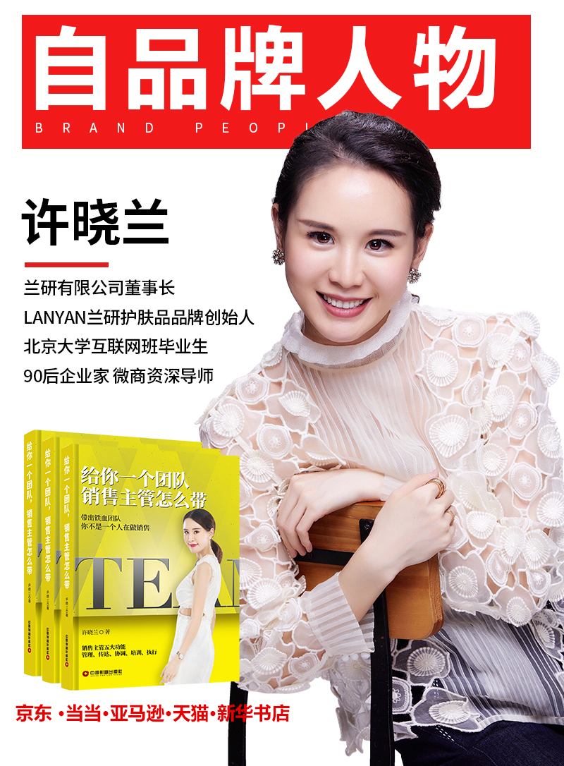 兰研有限公司董事长,畅销书作者许晓兰女士的著作,人生第一本书——《给你一个团队,销售主管怎样带》一书自委托出书大师网出版上市以来,在微商界引起了不小的轰动,吸引了大批粉丝争相抢购。这本书从如何针对团队内部的特色,立足销售主管的角色,展开针对性的管理,使团队的赢利不断地扩大入手,着眼于对切实提高销售团队的的:管理、传达、协调、培训、执行。书中从将可持续付出由自我认知扩展到团队之中,保持团队的前进状态,让团队在对手与伙伴的激励之下,形成良性自进化,带领团队在困难、挫折与机遇并存的当下,更好地全力挑战。通过阅读本书,团队带头人将更加具备长远的眼光、充足的市场知识以及个性化的管理特色,从而在销售管理中建设成熟的团队,获得持续的盈利的同时使团队不断壮大。该书在各大网络商城一经面世就受到了火热追捧,并在许晓兰女士书友会中广为传播。