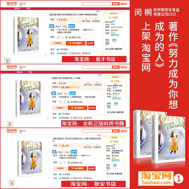 近日,由中国纺织出版社出版、出书大师网全权出版策划、香港佑珍国际CEO闵桐老师创作的著作《努力成为你想成为的人》正式上架京东等各大图书销售平台,与广大读者朋友们见面,从而开启了火爆热销序幕。