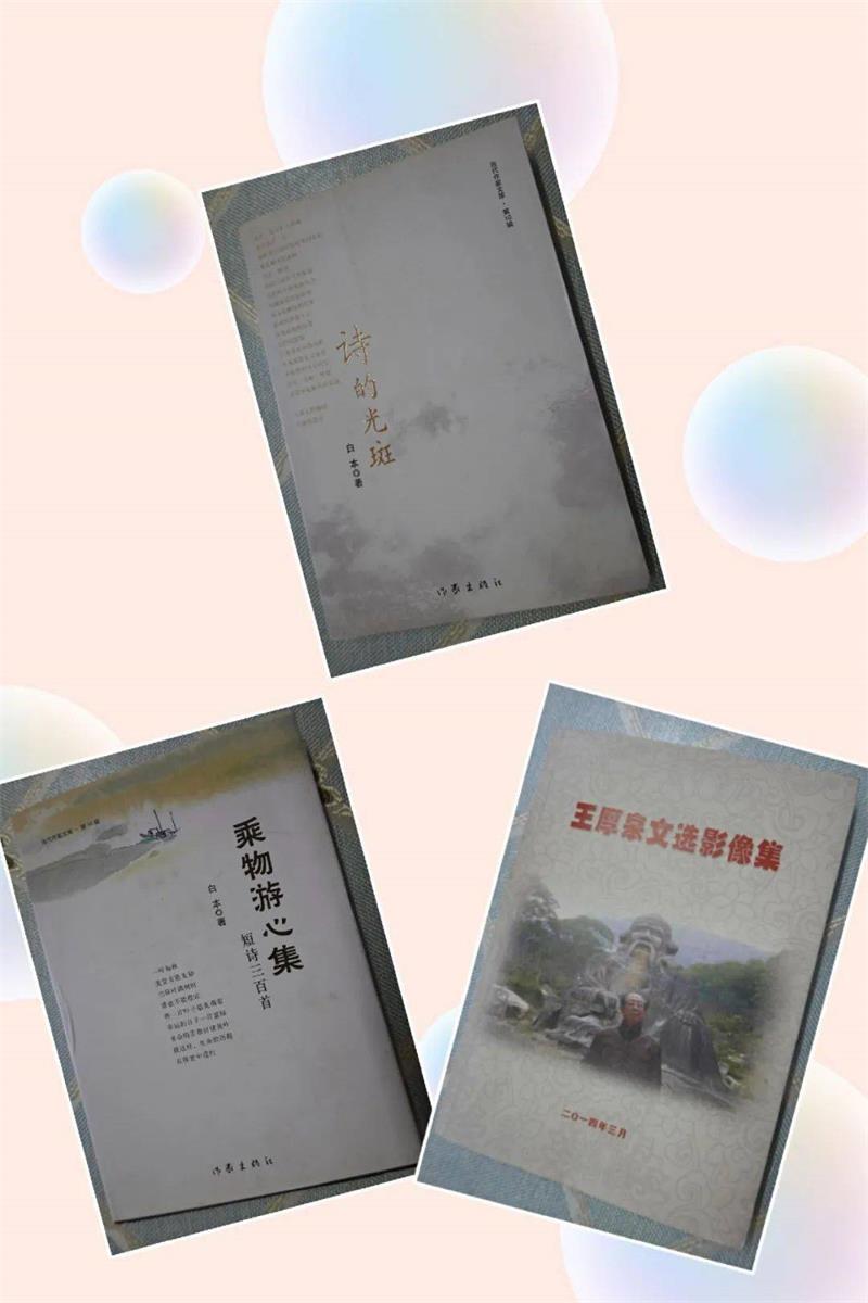 他著述《王厚皋文选影像集》《议论文分类示范指导》等教学用书二十余种。由儿子、东中88届校友王传序,女儿、东中86届校友王传捷协编了《白本诗集》三册。《诗的光斑》《乘物游心集》(短诗300首)《雨滴》三本诗集先后出版。其作品散见于国内及国外华文期刊,北美高校编辑的《联盟诗社诗集》亦有收录,有数十首入选《中华当代诗经》等多部典籍。《牛棚记事》《站在山海关城楼上》《镜子里的姑娘》在我校校友刊物第一期《我是东中人》“校友文苑”栏登载。其简历收于《中华作家大辞典》。
