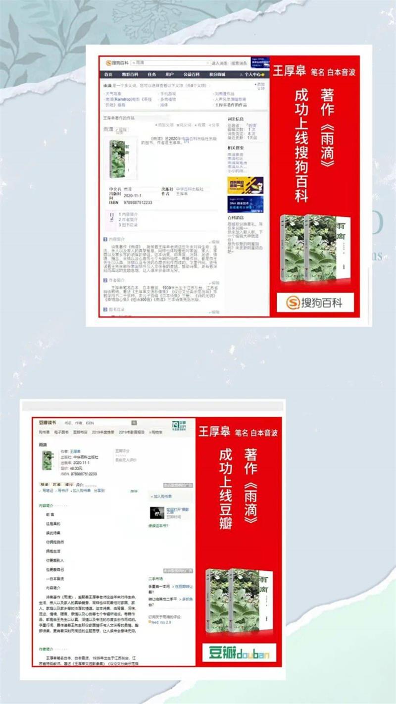 《雨滴》收集的,主要是王厚皋近几年诗的汇集。去年11月《雨滴》出版后,上线百度、头条、搜狗等各大百科平台以及豆瓣读书,这些媒体纷纷对《雨滴》进行了热情地推荐。这是王厚皋多年写作以及著作本身被机构和广大读者认可的一种证明,不仅体现了这本图书自身的权威性、被认可度、受欢迎度以及美誉度,而且更体现了王老师以及作品自身的实力。