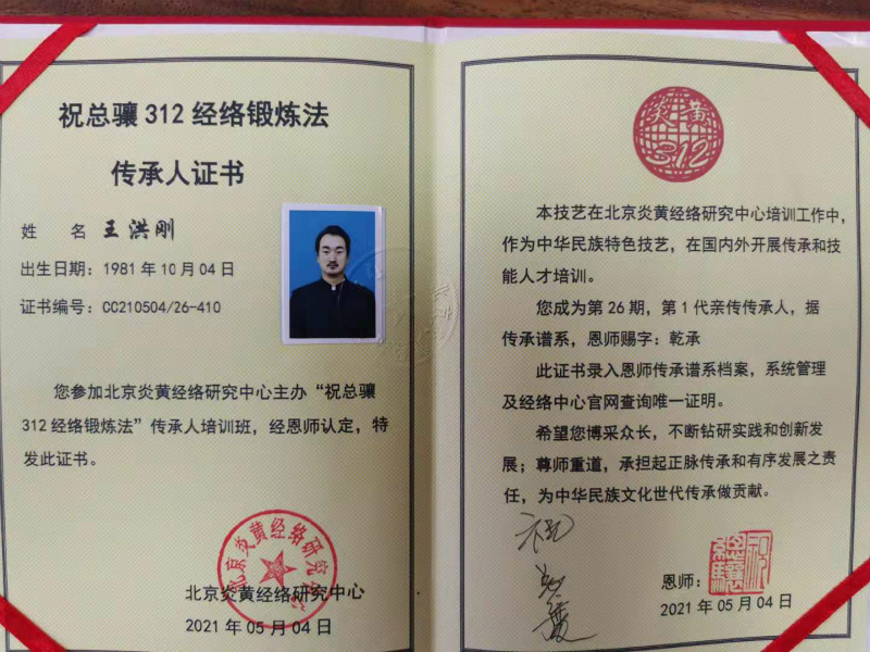 由于祝总骧老师作为一位德高望重的中国经络学家,他的312经络锻炼法效果和实用性都很高。为了可以让自己的中医药水平可以得到进一步提高,王洪刚老师用心、专注以及真诚地拜师祝总骧老先生,以参加北京炎黄经络研究中心主办的祝总骧312经络锻炼法传承人培训班。