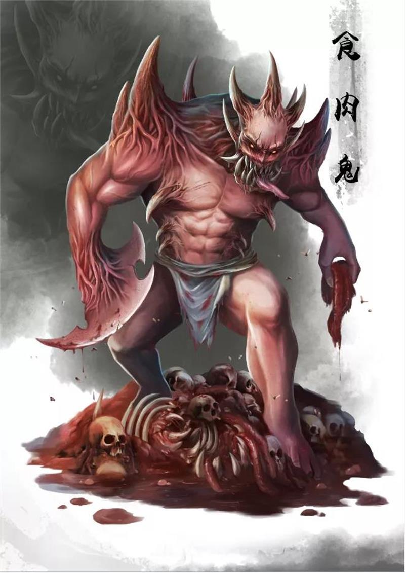 食肉鬼,面貌丑陋不堪,令人心生憎恶,此鬼生前是屠夫,屠杀牲畜并将各种牲畜切割出售,靠缺斤短两赚昧心钱,或挂羊头卖狗肉,以假充真。变成食肉鬼后,专门吃腐烂的动物尸体,然后传染毒菌、祸害生灵。因此对于动物死尸,不可乱抛于垃圾桶或水沟等脏乱之处,以免被此鬼所吃。《正法念处经》所记载三十六鬼之一。
