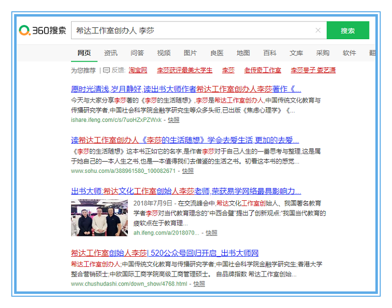 360、搜狗、百度作为国内极具影响力的搜索引擎,被它收录的个人或企业信息,往往具有广泛的被认可度和被传播度。由此可见,李莎老师的个人品牌网站被360、搜狗、百度成功收录,不仅极大地提升了李莎老师的品牌价值与魅力,有利于宣传品牌,又能够吸引大批流量与优质资源,从而扩大个人影响力,也希望在未来的日子里,李莎老师能够继续砥砺前行,借由庞大的网络流量,让自己的个人品牌发扬光大。