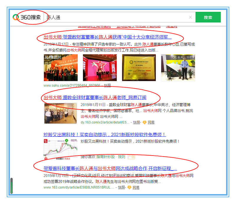 在众多的媒体中,作为世界闻名的中文搜索引擎,360、搜狗和百度极具含金量,是大国人几乎每天都要使用的平台,深受国人喜爱。陈人通老师个人品牌网站被三大平台收录后之后,点击平台链接,输入相关内容,即可跳转品牌页面,实现了其个人品牌的传播与推广。