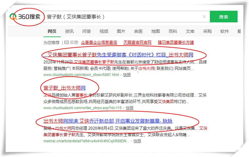 近日,艾侠集团董事长曾子默书作者关键词收录360、搜狗、百度平台。大众只需在360、搜狗、百度三大平台页面搜索“艾侠集团董事长 曾子默”等相关关键词,即可获取大量曾子默老师个人及其品牌的相关内容。通过这样高效快速的方式,曾子默老师的个人品牌得到全面推广,这不仅能够提升曾子默老师个人魅力和品牌实力,同时有效增强其品牌影响力和知名度,提升大众对品牌的好感,将大众转变为品牌顾客,最终成功实现个人IP变现。