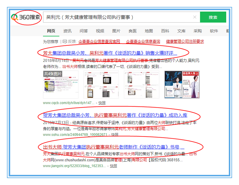 近日,芳大健康管理有限公司执行董事吴利元书作者关键词霸屏360、搜狗、百度平台,带来了品牌流量,形成了以吴利元女士为核心的品牌IP,只需在平台界面搜索“吴利元”相关关键词,便会迅速跳转页面连接品牌信息,快速的完成吴利元女士的品牌信息流入,全面提升了品牌影响力。