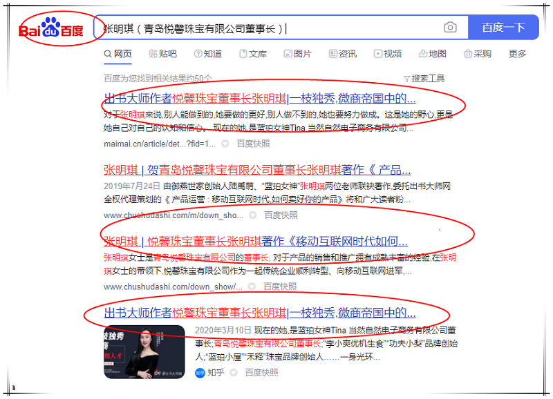 近日,青岛悦馨珠宝有限公司董事长张明琪书作者关键词登顶360、搜狗、百度平台,不仅带来了流量内容,也形成了以张明琪女士为核心的流量品牌IP,粉丝读者只需在平台界面搜索“张明琪”相关关键词,便会迅速跳转页面连接品牌信息,快速的完成张明琪女士的品牌信息流入,提升了行业知名度与品牌影响力。