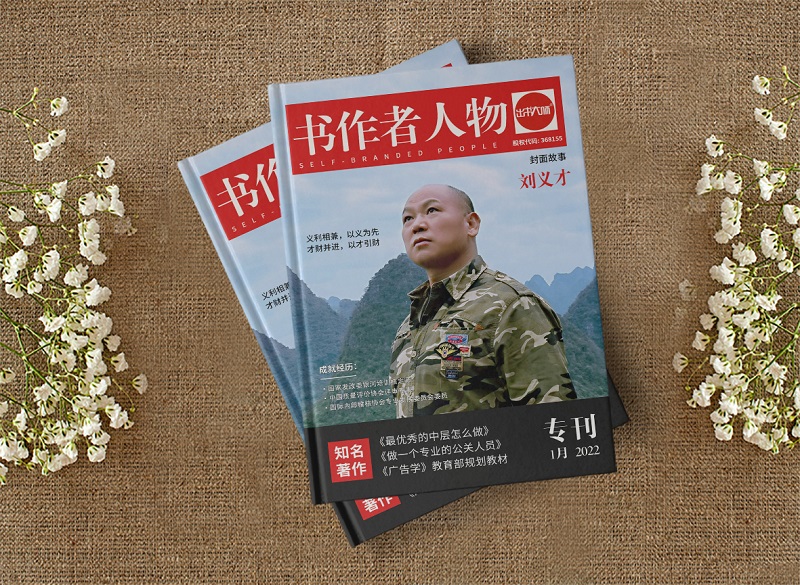 封面中的刘义才老师身着一身迷彩装,侧对镜头,眺望远方,神情自信且坚定。出书大师网封面杂志展现了其三本著作:《最优秀的中层怎么做》、《做一个专业的公关人员》、《广告学》教育部规划教材,从中不难看出,刘义才老师是一位优秀的、充满权威性的行业专家。“义利相兼,以义为先;才财并进,以才引财。”这是刘义才老师对此次登上人物封面后的感想。他说道:“义利相兼,以义为先”是中国传统文化鲜明而独特的价值准则和精神标识,也是个人为人处世的原则和信仰,在日常交往中,要自觉地把“义”与“利”的理念统一起来,自觉地把个人利益的要求与社会利益相协调。