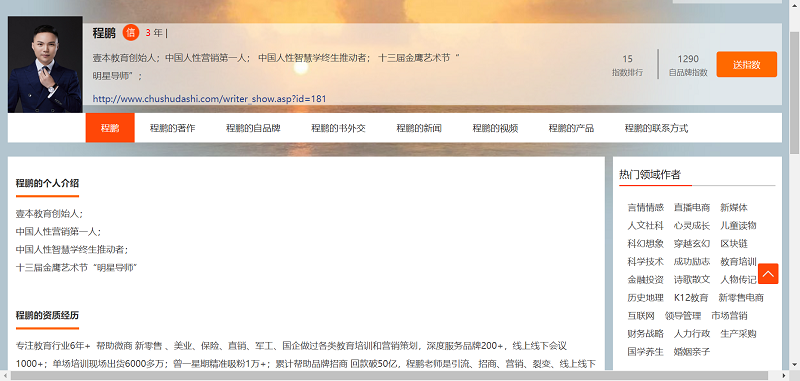 诚信书作者平台是提升书作者知名度的重要平台,通过流量的精准传播提升书作者在全网的权威和魅力,扩大书作者粉丝圈。在今后的合作中,出书大师网将充分利用网络资源,抓住程鹏老师个人特色,努力实现流量的精准传播,用书成就其自身个人品牌发展,有效地拓展程鹏老师在其品牌领域的版图。