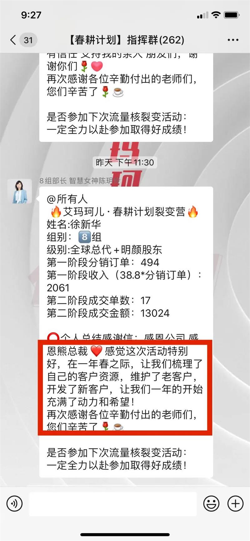 在活动展开过程中,微赢共创的专业导师团队为代理赋能,在社群内进行高效课程输出,不断鼓励代理、激发代理活性,让每一位艾玛珂儿的家人能够通过这次旅游有一次新的体验,面对生活压力也能展现自己最勇敢的一面。在这次旅游的过程中,赋能导师全程陪跑,进一步帮助代理解决销售问题,传授专业的销售话术,帮助代理成交客户。同时创始人带领整个团队,给予代理信任。