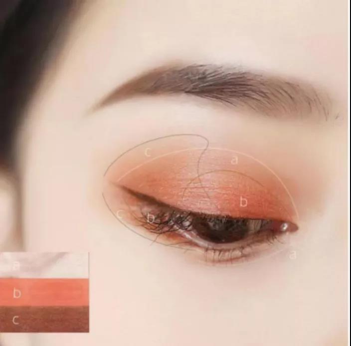 2.选取饱和度较高的中间色,从眼头开始,沿着上眼框往后慢慢晕开,并且轻轻扫过下眼睑,使之与上部分的眼妆形成呼应。