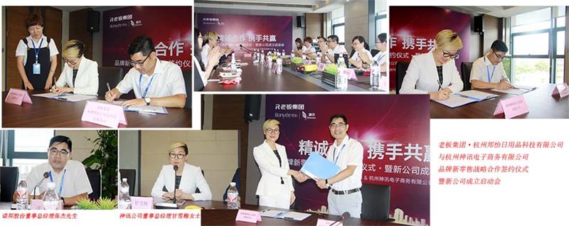 2017年6月10日13时30分,“老板集团·杭州邦怡日用品科技有限公司与杭州神讯电子商务有限公司品牌新零售战略合作签约仪式暨新公司成立启动会”在诺邦股份一号会议室顺利举行。此次签约,标志着双方建立了稳固的战略合作伙伴关系,为“建设品牌新零售渠道”项目取得成功奠定了良好的基础。