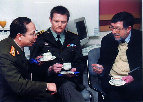 2003 年,金一南(左)在英国皇家军事科学院与德国著名学者施密特教授(右)交流。