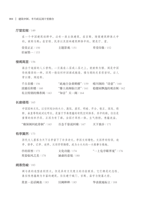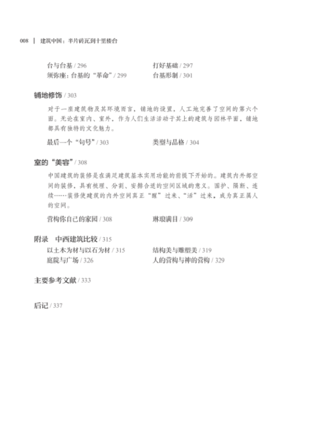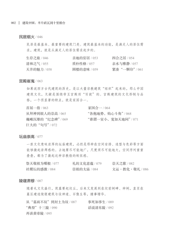 建筑是“杂芜”的,最不“纯粹”的艺术——它被“糅合”在生活中的各种实用目的里,掺杂着权力、阶级、性别、地域、时代、风俗等重重影响。如何使针对建筑美学的抽绎,既不脱离现世,又能深入其内蕴的精神“尺度”,是建筑美学学者自觉和成就其“使命”的“地平线”。所谓话语的“张力”,不是由堆砌隐秘晦涩冗长的理论术语来完成的,事实上,《建筑中国:半片砖瓦到十里楼台》更像是一部建筑美学的心灵随笔——其适应性广泛,语言节奏简练紧凑的同时,汪洋而不肆意,浩瀚而不枝蔓,平实而不媚俗,深邃而不玄虚。