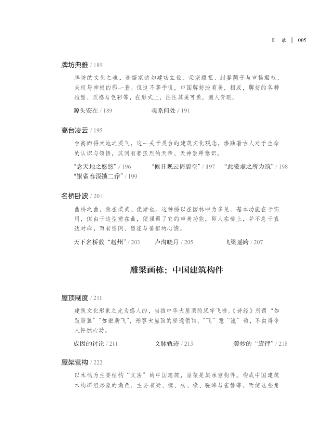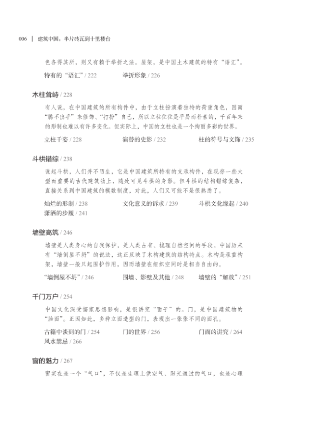 何谓“浅薄”?非黑即白的世界即为“浅薄”,因为非黑即白的世界是可以用线性逻辑掌控和把握的,面对一个非黑即白的世界,言说者所完成的动作只是描述,只是证明。何谓“张力”?在黑白之间,非黑非白,即黑即白的世界才是有“生命”的,因为这样一个世界无法用线性逻辑来掌控和把握,面对一个非黑非白,即黑即白的世界,言说者所完成的动作,却是设身处地地体验和领悟。如是体验和领悟,只能用自我的生命与对象彼此牵扯、拉动、映衬、圆融才有可能实现。所幸的是,《建筑中国:半片砖瓦到十里楼台》正是这样一本著作。它不仅是作者自我经验的呈现,更是每一位读者足以窥探中国古代建筑之流动意象,可亲可敬,足以信赖的“路径”。