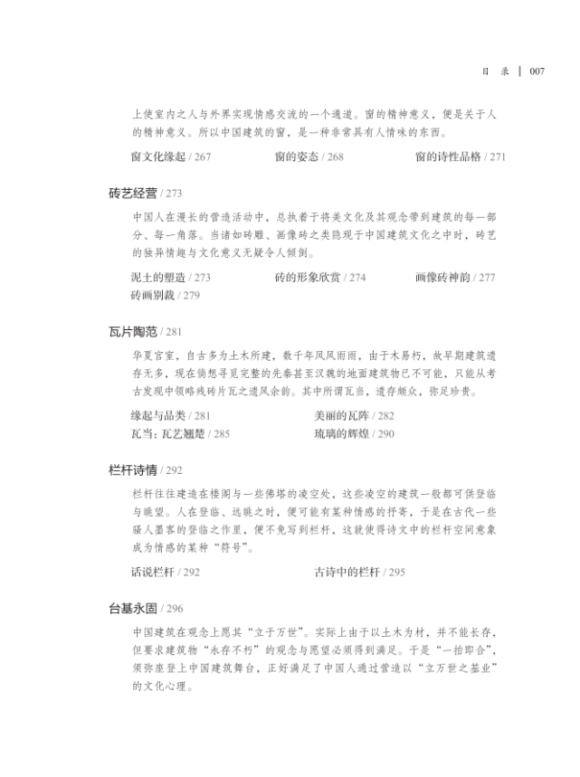 《建筑中国:半片砖瓦到十里楼台》中,“半片砖瓦”可谓建筑的质料、单元和构件,治“小品”;“十里楼台”可谓建筑的门类、形式、习俗、制度和操守,为“大作”。二者均不以某种单一的建筑形态和艺术成品为逻辑线索,而是在逻辑上解读中国古代建筑艺术赖以“建构”,抑或“孵化”的“能量场域”。例如说窗,有长有短有半有扇,有横风有和合,有开、闭、漏、轴,有四方有六方有八方,有砖框的花窗有围屏的纱窗等。但最终,书中文笔一转,说窗的开设是为了“透气”,是为了居室的“呼吸”,所以,“窗户,是一种人工对大自然和空间的‘剪裁’,它使人对自然景观的欣赏显得更‘艺术’,更有选择,具有天人合一的另一番妙趣。”笔锋转折前的知识或许不难积累,难在笔锋转折后的境界,难在对建筑所隐含着的审美意蕴的开掘——在形上和形下的屯蒙间,审美意象渐次生成的“履历”得以再现。这才是文化研究的魅力,文化研究不只是一种固执的“立场”,更是一种现实的带有生命性经验的“应机”。