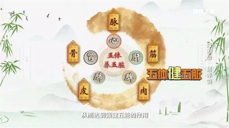 五体平衡操分为调息益肺、强肌健脾、通脉养心、伸筋舒肝四节,可以调整呼吸节律、顺脾胃之气、促进气血运行和强骨补肾。