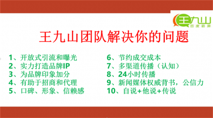 最后再补充一些个人观点:大家做百度霸屏业务除了能打造公司品牌ip之外,也为产品增强了信任背书。百度霸屏就像24小时的业务员,具有自带成交属性,百度霸屏一旦完成布局,会长常年在百度、360、搜狗等搜索引擎展示,后续也不需要另外付费,会给企业带来长期价值。推荐王九山,是因为和王九山老师合作过并深度认可他,分享价值也算是一种慈善,愿大家不要走弯路,与良人为伴。