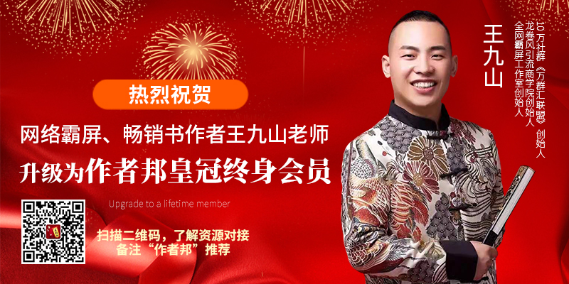 近日,网络霸屏引流专家王九山老师,正式升级为作者邦平台的皇冠终身会员,将享受来自作者邦的终身优质服务,他的个人品牌影响力得到全面性的提升。
