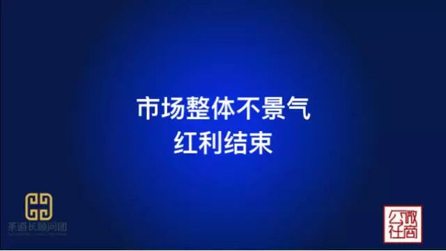 以我辅导的微商品牌和我们培训的大量微商团队的反馈,业绩普遍下跌,甚至很多业绩是跳水下跌。除个别品牌外,实际情况也是如此,微商整体不景气,根本原因也很简单——红利结束。