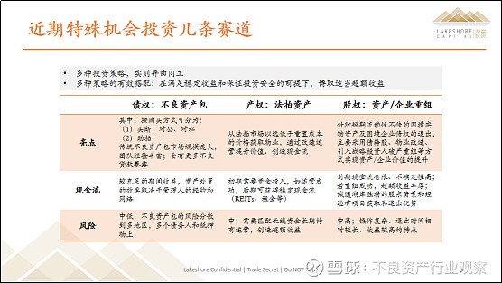 产权就是推动法拍获得资产,他认为产权关系相对比较明确,绕过了比较复杂的打官司、诉讼以及破产重整这样的风险,只需要评估价格或清场,所以法拍资产是一个比较大的机会。