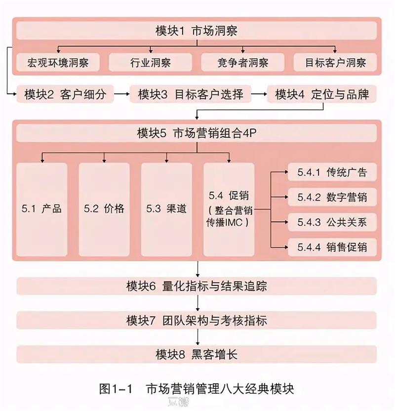 “市场营销八大模块具体指:市场洞察、客户细分、目标客户选择、定位与品牌、市场营销组合、量化指标与结果追踪、团队架构与考核指标、黑客增长。”—《极简市场营销》