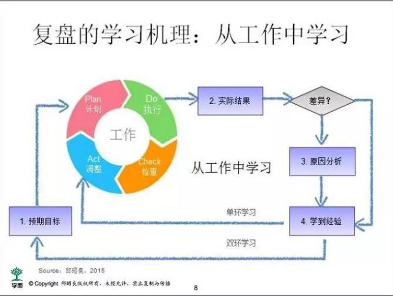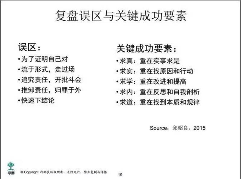学习。复盘以学习为导向,不仅仅是为了做总结或绩效评定。当然,这个学习既包括“知”,即获得了一些经验教训,也包括“行”,也就是实现未来的行为改善。后者可能更为重要。