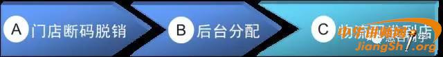 快速回应门店商品需求是鞋业百店连锁的铁血生命线,多年来对企业的商品决策作业流程跟踪结果显示:只有30%的门店畅销款断码是发现不及时(缺乏专业分析工具)造成的,50%是后台调配决策速度过慢造成的,有些门店的补货申请在后台片区要处理3-5周,其实公司从B点到C点的失误并不是最严重,因此商品调拨管理最关键要解决的是A点到B点的标准化工作问题,见图1。