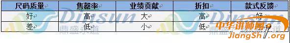 尺码质量用来区分商品在门店的推广难度,断码是指号从中间卖断、全码是指号没断、齐码是指尺码两头断”。