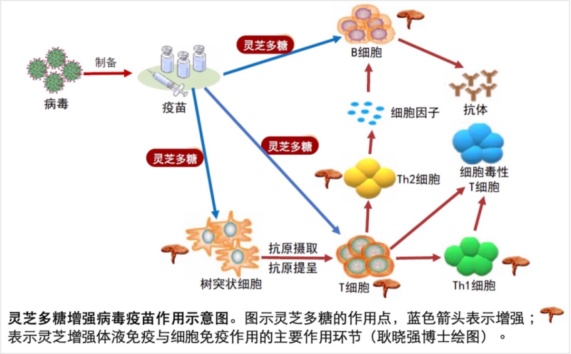 将灵芝多糖作为免疫佐剂增强疫苗保护效果,以及灵芝增强体液免疫与细胞免疫的主要作用环节汇整如下,让我们更加明白为什么疫苗要打,灵芝也要吃。