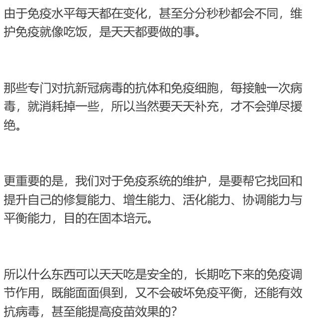 这就是为什么疫苗要打,免疫也要持续好好维护的原因。想想看,什么东西可以天天吃而且是安全的?长期吃下来的免疫调节作用是既全面又平衡的?