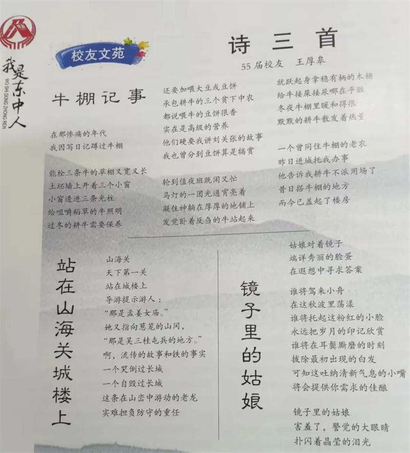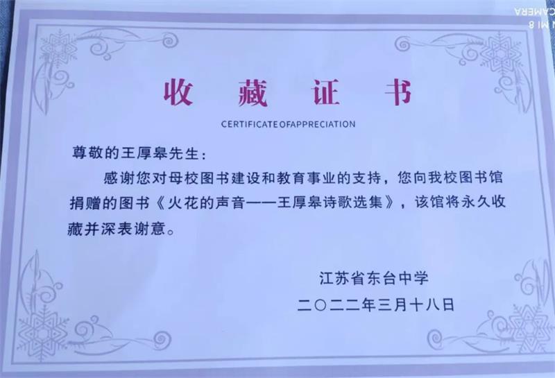 “谢谢王老师的赠书,感谢他对母校图书建设的支持和学生阅读的关心。”我校党委书记、校长卢惠斌收到王老师诗集时说。 “来信阅悉。厚皋是我东中同窗,新著问世理当祝贺,如蒙赐寄,不胜感激”。这是亚洲英语协会原副会长、复旦退休教授、东中申淑仪助学金创设者李荫华给笔者的回信。“谢谢王老师,谢谢您!现在快递不方便,我回家乡时联系您。祝愿王老永葆诗心,佳作不断。”国际《尚书》学会会长、全国政协国学导学专家、曾任我校语文老师的扬大博导钱宗武知悉赠书后回复。