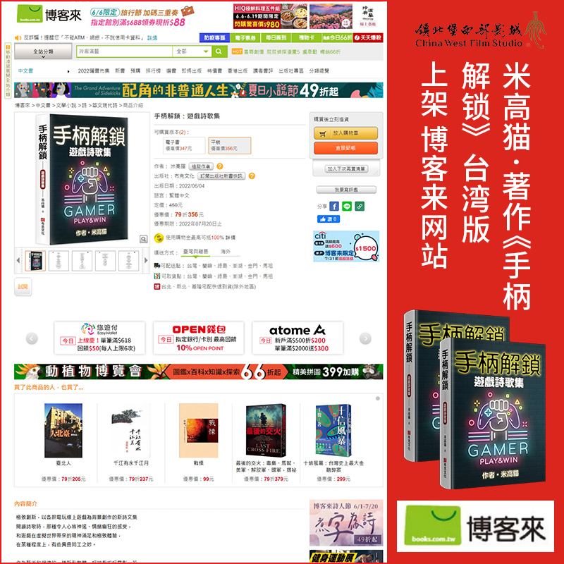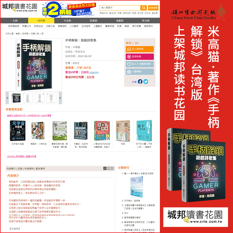 近日,由米高猫创作的最新著作《手柄解锁》台湾版,正式上架博客来、城邦读书花园、诚品线上以及金石堂等各大网络销售平台,拉开了热销的序幕。