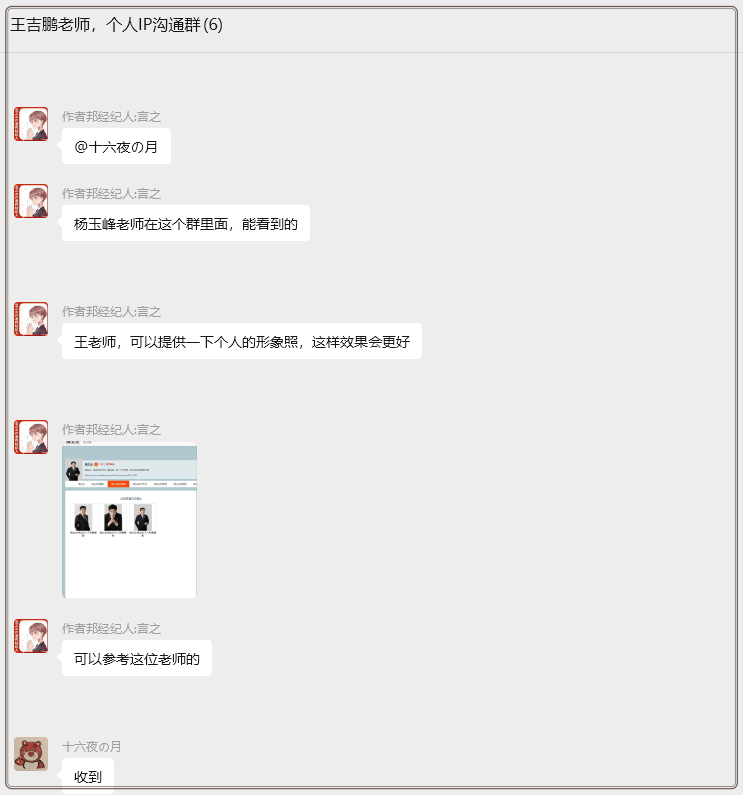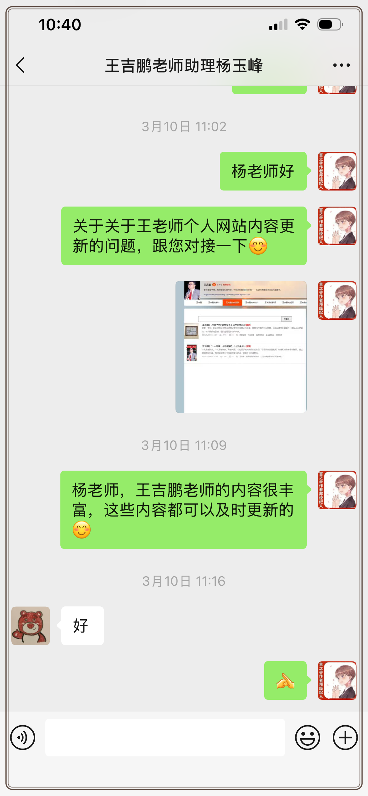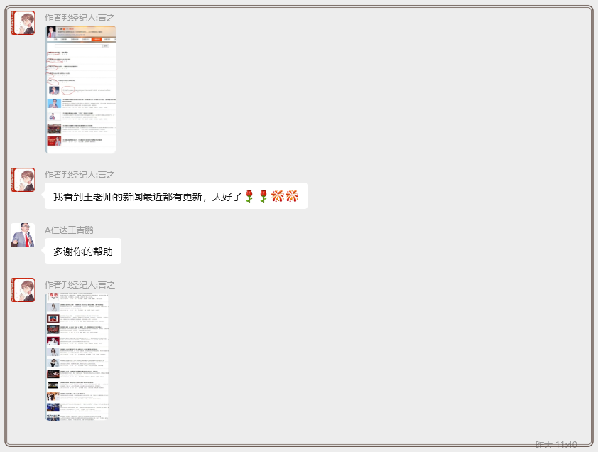 面对清晰的需求传递与能力展示,王吉鹏老师助理杨玉峰以简洁的“好”字作出回应,虽寥寥数字却分量十足。这不仅是对本次对接诉求的明确认可,更是对后续内容更新工作的积极响应,标志着双方在网站内容运维方向上达成初步共识。