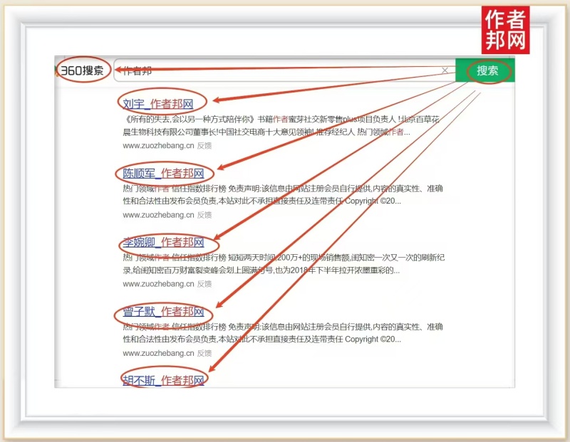 近日,我们只要在360搜索引擎中输入关键词“作者邦”,便可以看到大量入驻作者的个人网站入口链接,见证作者邦网的宣传实力和品牌影响力,大力辅助各行业畅销书作者个人营销推广。从这些搜索...