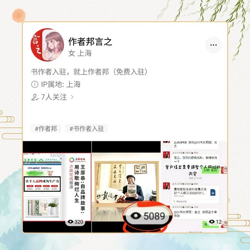 作者邦网,尤其注重书作者品牌网站的展示与呈现,并极力塑造出书作者的形象风采。在众多网友当中,留下了书作者有品位、有魅力、有价值的深刻印象。而作者邦网,为作者讲好故事、传播书作者声音...